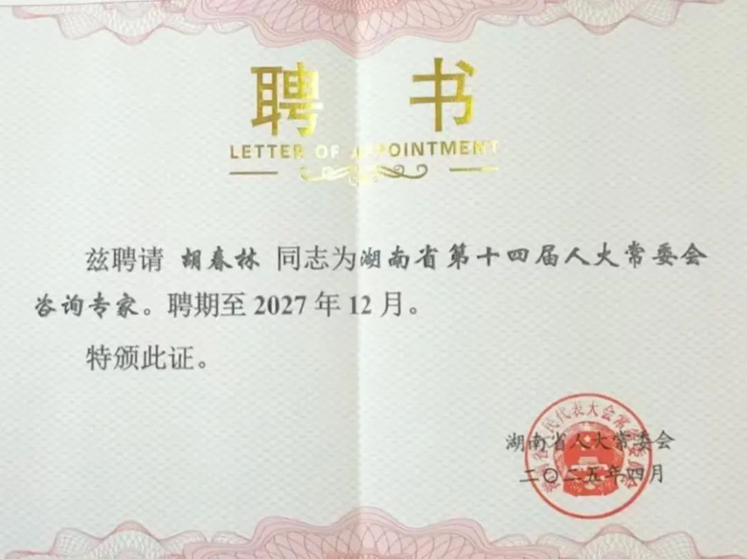 喜訊 | 胡春林董事長受聘擔(dān)任湖南省第十四屆人大常委會咨詢專家